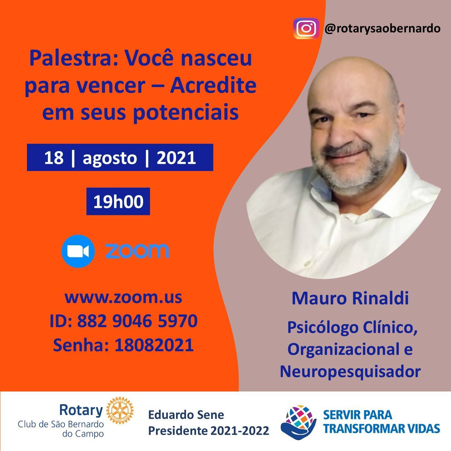 Reunião em 18/08/2021, às 19h00, com Mauro Rinaldi, Psicólogo clínico, organizacional e neuropesquisador, palestrante em clubes de Rotary, fará a palestra “Você nasceu para vencer – Acredite em seus potenciais“.