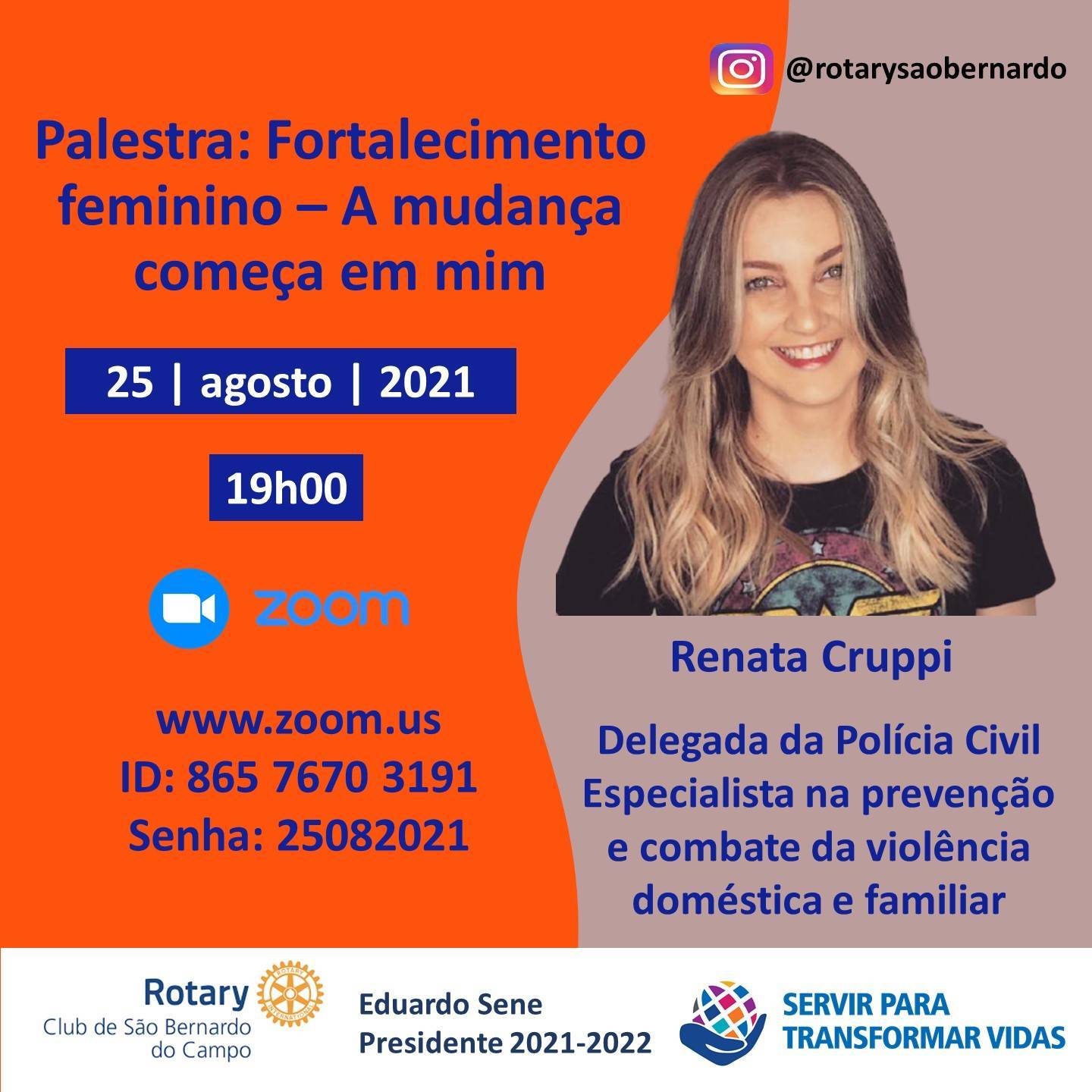 Reunião em 25/08/2021, às 19h00, com Renata Cruppi, Delegada da Polícia Civil do Estado de São Paulo, especialista na prevenção e combate da violência doméstica, fará a palestra “Fortalecimento feminino – A mudança começa em mim“.