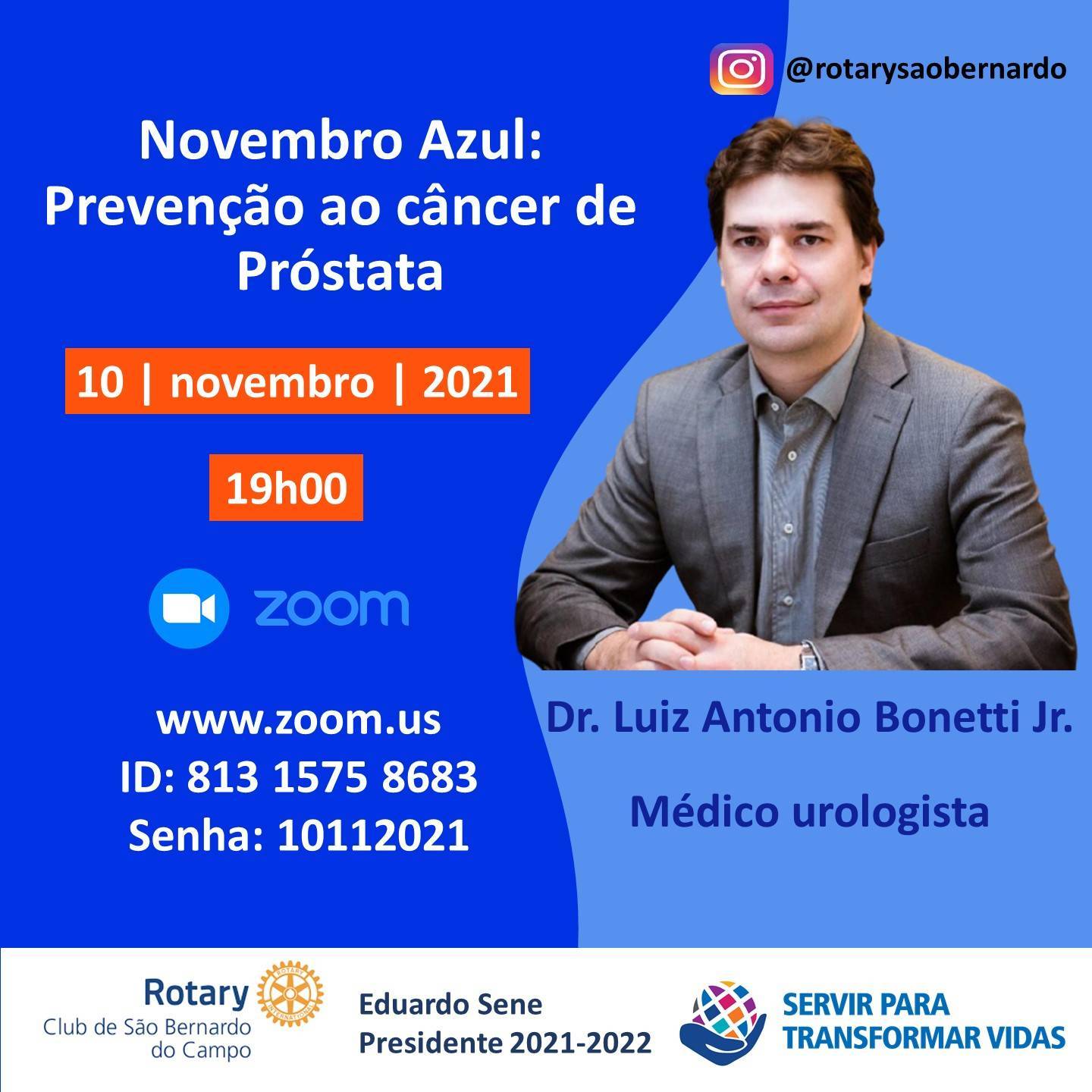 Reunião em 10/11/2021, às 19h00, com o Dr. Luiz Antonio Bonetti Júnior, médico urologista, que fará a palestra “Novembro Azul: Prevenção ao câncer de próstata“.
