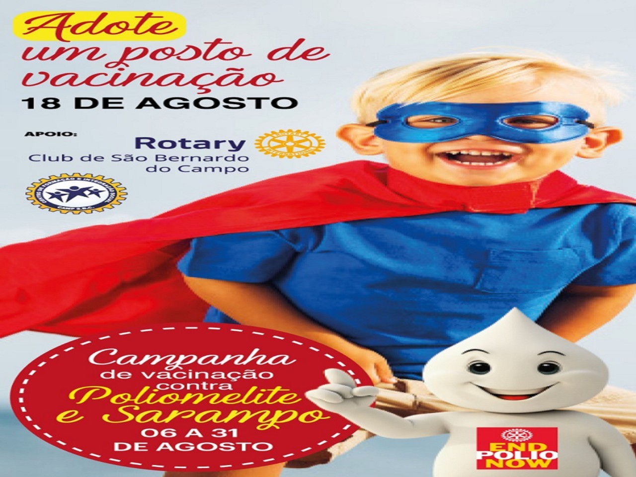 O Rotary Club de São Bernardo do Campo participou da Campanha Nacional de Vacinação - Sarampo e Poliomielite, durante o mês de Agosto, mobilizando-se para conscientizar os pais para a importância de levar seus filhos para serem vacinados. A divulgação aconteceu em creche, escola de esporte, escritório, comércio, UBS do Taboão, e nas comunidades afastadas do centro da cidade, por meio de faixas e mini banners informativos.