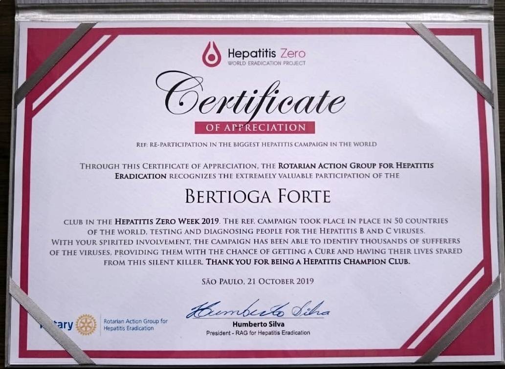 Recebemos o certificado de participação na Campanha Mundial de Erradicação da Hepatite C