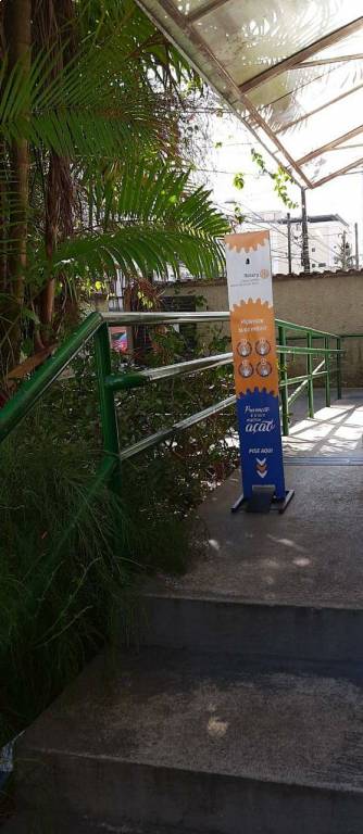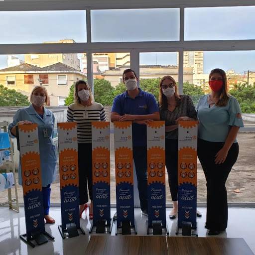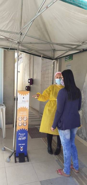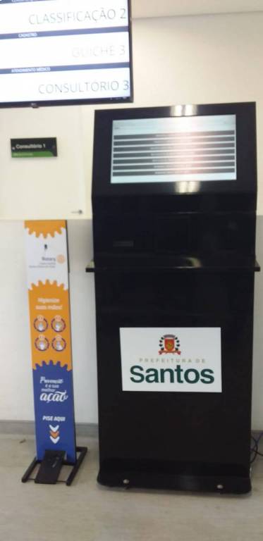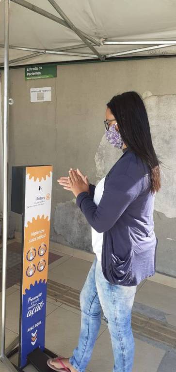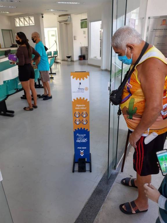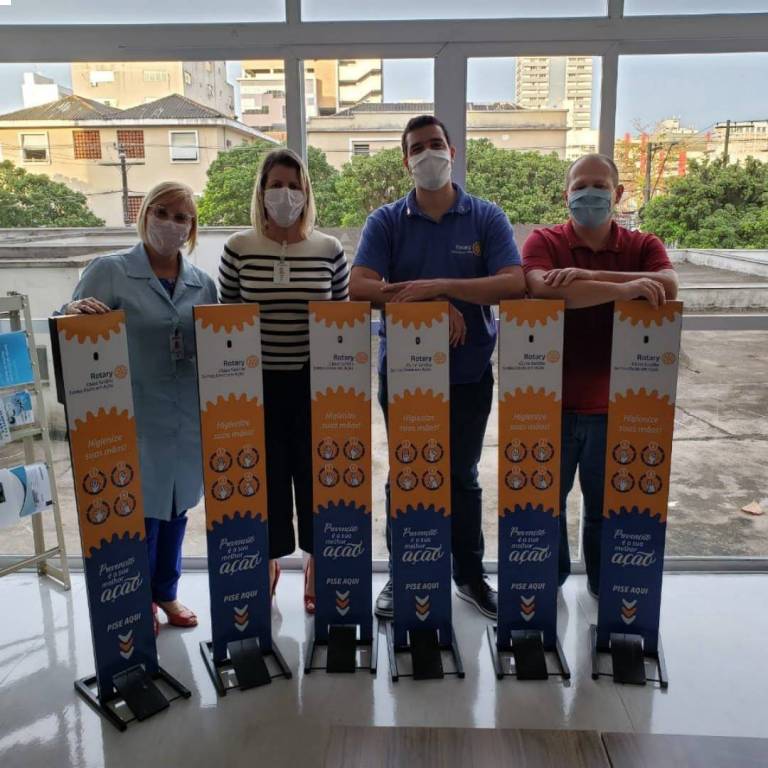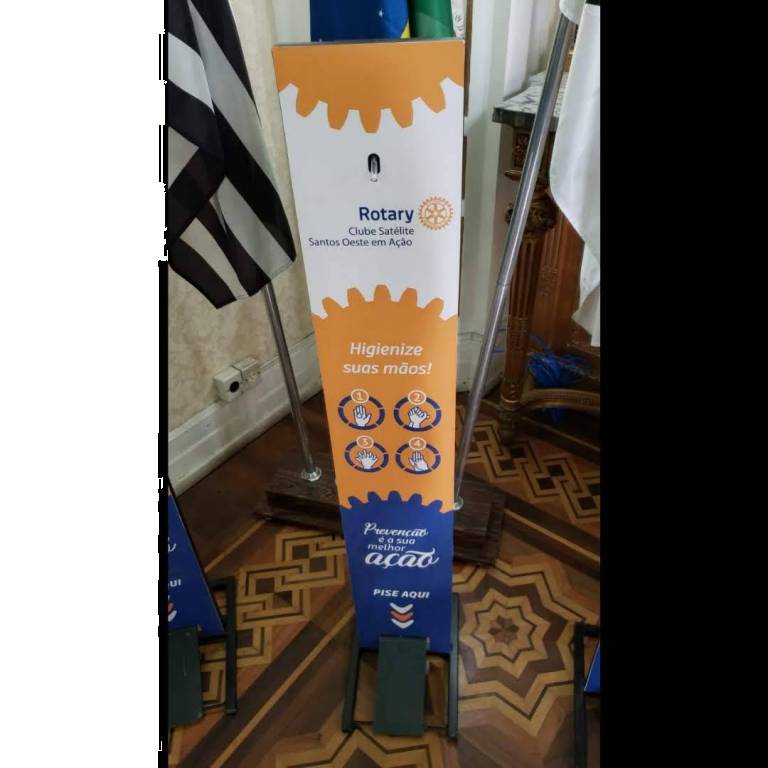 E o Rotary Club Satélite Santos-Oeste em Ação e o Rotaty Club Santos-Oeste fizeram a doação totens de álcool em gel à Prefeitura de Santos para serem utilizados nas unidades de saúde da cidade.