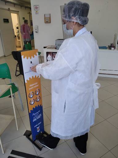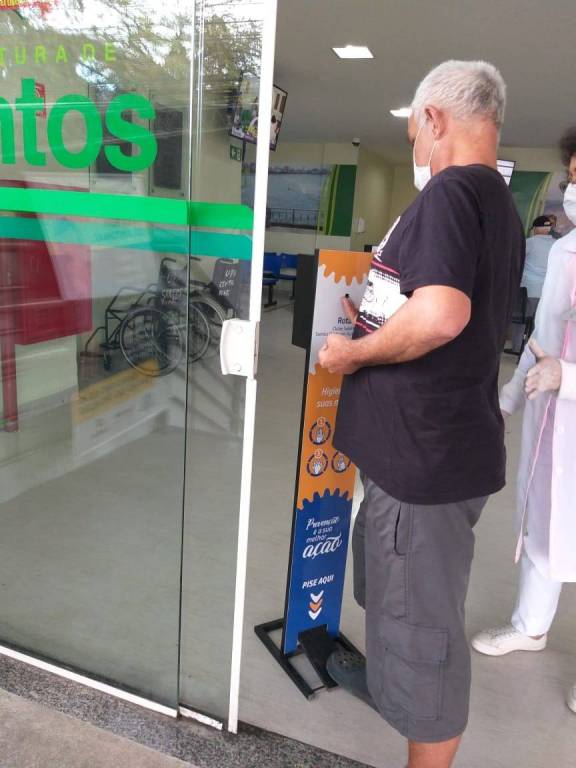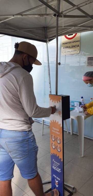 Com o totem, as pessoas não precisam ter contato com nada, o dispenser do álcool em gel é acionado com pé, favorecendo o distanciamento e higienização de todos que entrarem nas unidades.